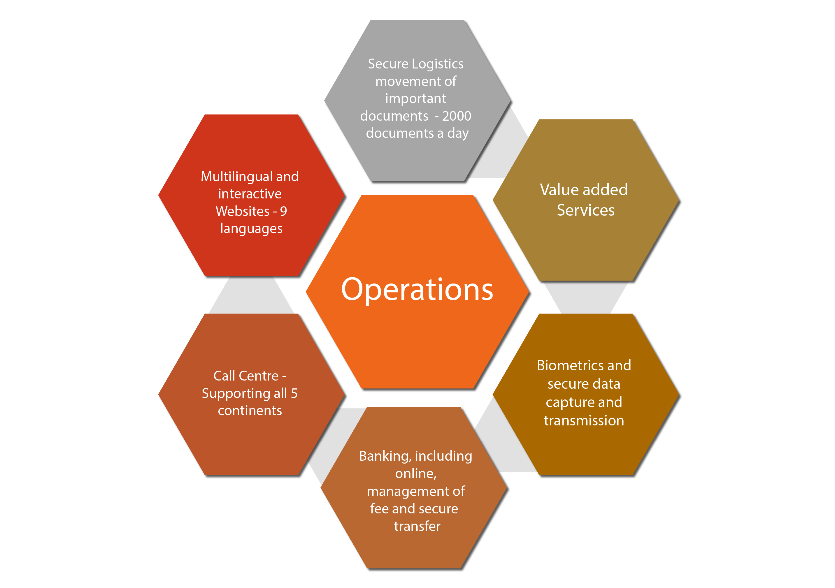We directly manage outsourcing services in over 16 countries with a network of offices in 33 cities, we have substantial knowledge of local operations across the world. Our operations have heavy IT usage and direct public interaction with more than 200,000 people in a year. We work with local Banks in each country to manage the financial transaction that include physical cash, Credit & Debit cards, and online payments. We work with logistics companies for the movement of highly secured documents. Our local HR and accounting teams manage the support functions and local compliance in each location.
